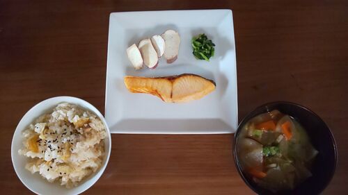 娘のushioです。 10月10日、11日に届いた野菜をどんどん消費しています。 夕食はこちら。 母が送ってくれたCOOPの塩鮭と、グリルの空いているところにさつまいもを置いて、同時に焼きました。 野沢菜の漬け物と、大根・人参・シイタケ・油あげの入ったみそ汁…