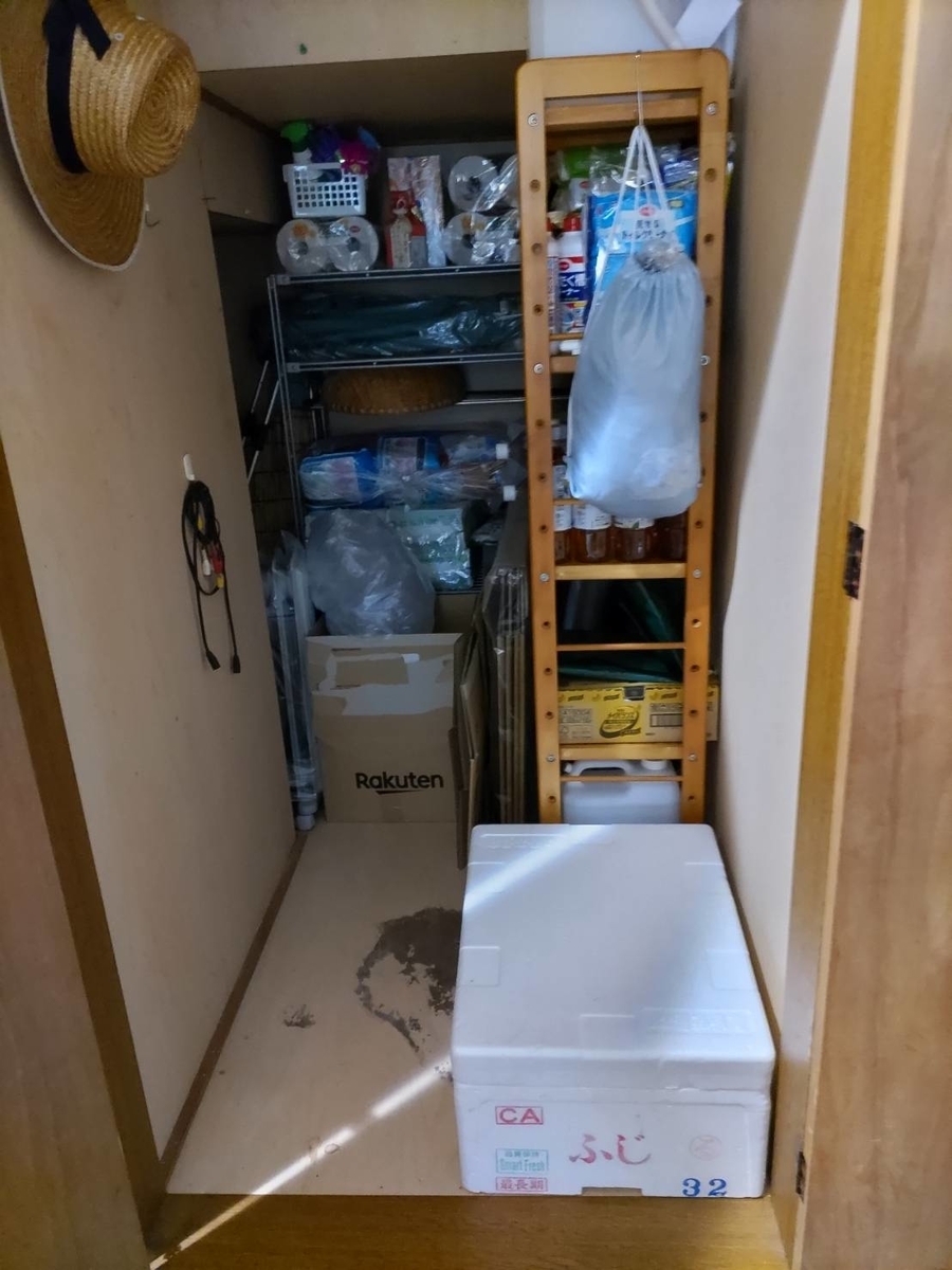 日用品のストック、季節家電や使用頻度の低い家電、畑で収穫した野菜、COOPさんで頼んだものをここに押し込んでいます。
